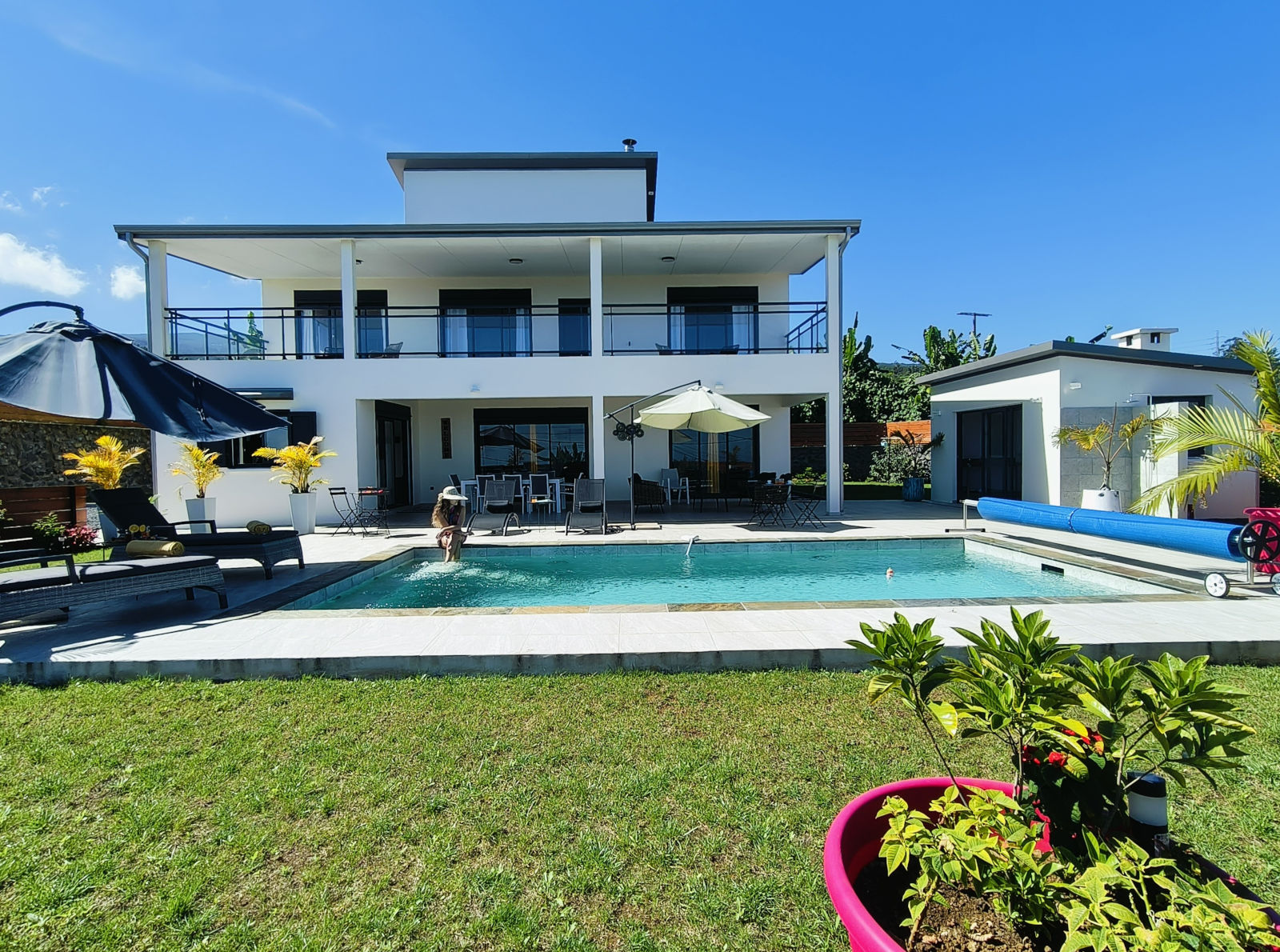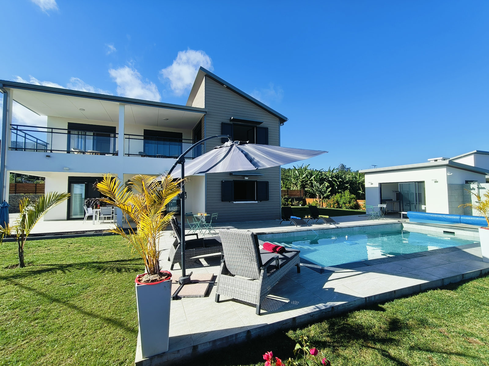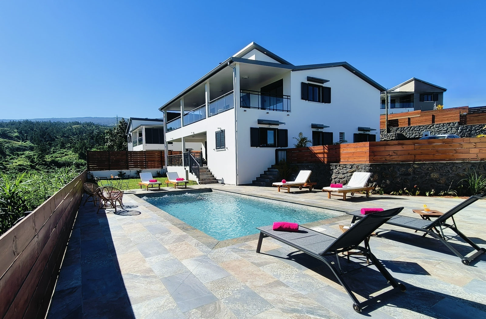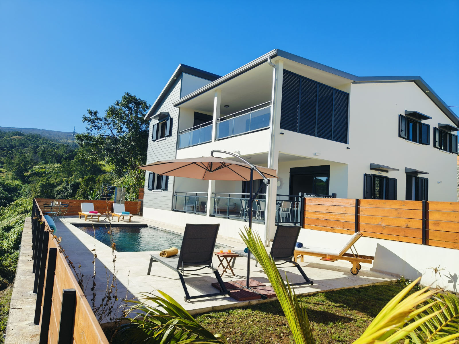Comme des émeraudes dans un écrin de verdure, ces villas indépendantes de grand confort, modernes et spacieuses pouvant accueillir 12 personnes, situées dans l’ouest de la Réunion à 900 mètres d’altitude, vous immergeront dans le calme et la sérénité. Piscine chauffée pour chaque villa, cuisine extérieure pour y préparer les grillades et les célèbres caris au feu de bois typiques de la Réunion, fleurissement tropical, tout y a été pensé pour vous faire vivre un dépaysement total dans la fraîcheur des hauts de la Réunion. Vous vous enivrerez de leur situation exceptionnelle, non loin du Maïdo, avec vues sur l’Océan Indien et descente vertigineuse vers les plages de Saint-Gilles.